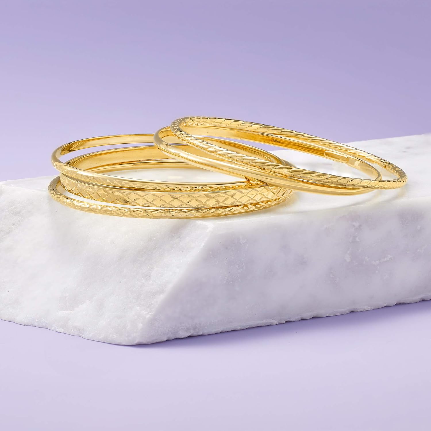About this item 18KT GOLD OVER STERLING — 18kt yellow gold over sterling silver jewelry set: five textured bangle bracelets. Textured and polished finishes. 7 in. long. Each bangle measures 1/8 in. wide. Clasp free, slip-on design. IDEAL FOR EVERYDAY WEAR — With its essential design, this bracelet set wears well whether you’re running errands, in the office or out with the girls. ROSS-SIMONS QUALITY — Treat yourself to the luxury of Ross-Simons fine jewelry. Whether your selection is made of 14kt gold, 18kt gold or gorgeous sterling silver, our jewelry always makes a lasting statement. THE PERFECT GIFT FOR HER — This is the ideal gift for your sister, daughter, mom, wife, niece, aunt, best friend, girlfriend — or yourself! Whether she prefers modern or traditional jewelry, Ross-Simons has a wide selection of bracelets, earrings, necklaces and rings to choose from. GIFT BOX INCLUDED — Ross-Simons jewelry arrives beautifully packaged in a gift box, ready to delight for any occasion, including birthdays, Christmas, Mother’s Day, anniversaries, Valentine’s Day, weddings, graduations and much more!