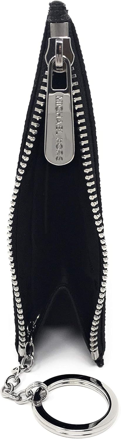 Monogram printed slim PVC coin pouch and ID holder with polished silver tone hardware Zip top compartment with card slip and a tethered split key ring inside Accented with Michael Kors iconic logo on the front Back offers a clear ID slot, (2) card slips and a larger slip Measures approximately 5" (L) x 3 3/8" (H) and has an MSRP of $118.00