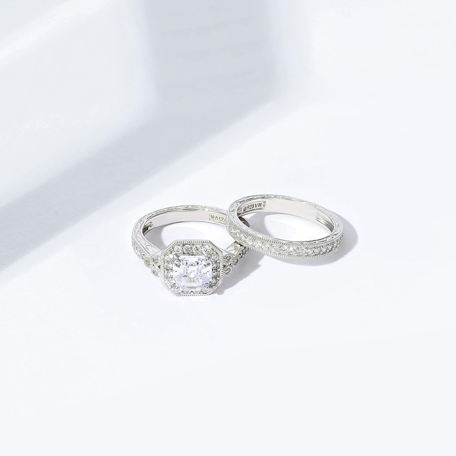 Sparkling antique-style ring with asscher-cut Infinite Elements Cubic Zirconia and band with prong-set faceted rounds. Both bands are adorned with prong-set faceted round brilliant cut Infinite Elements Cubic Zirconia. This jewelry design was manufactured with the highest quality standards. All efforts are being made to use sustainable resources and socially responsible providers. This item runs somewhat large, those between sizes should round down. These silver pieces are built for longevity. This piece features a metal plating or flashing, or an electrocoating for a more lustrous appearance, but it can wear off with long-term or heavy use. To ensure the longevity of your plated items store your jewelry in a dark, cool, dry place such as a pouch or air tight box and avoid rubbing plated items together. Also try to avoid exposure to cleaning products and perfume which can both negatively affect your items. Your local jeweler can advise you where to send your jewelry if you would ever like them replated.