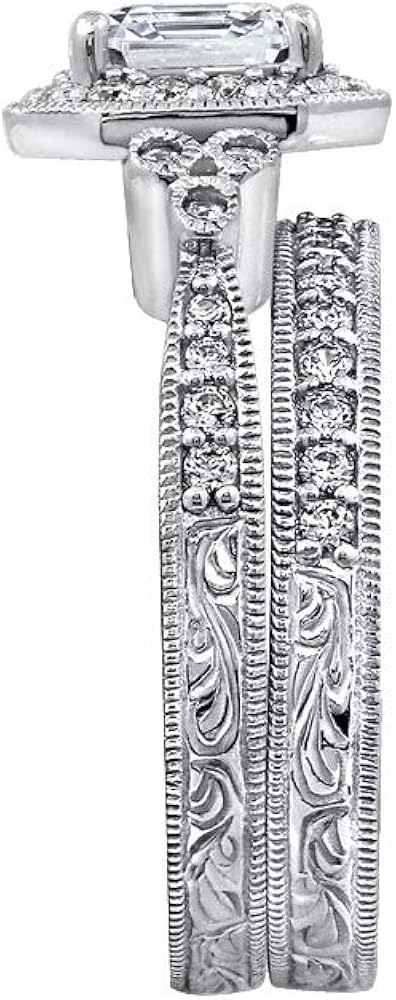 Sparkling antique-style ring with asscher-cut Infinite Elements Cubic Zirconia and band with prong-set faceted rounds. Both bands are adorned with prong-set faceted round brilliant cut Infinite Elements Cubic Zirconia. This jewelry design was manufactured with the highest quality standards. All efforts are being made to use sustainable resources and socially responsible providers. This item runs somewhat large, those between sizes should round down. These silver pieces are built for longevity. This piece features a metal plating or flashing, or an electrocoating for a more lustrous appearance, but it can wear off with long-term or heavy use. To ensure the longevity of your plated items store your jewelry in a dark, cool, dry place such as a pouch or air tight box and avoid rubbing plated items together. Also try to avoid exposure to cleaning products and perfume which can both negatively affect your items. Your local jeweler can advise you where to send your jewelry if you would ever like them replated.