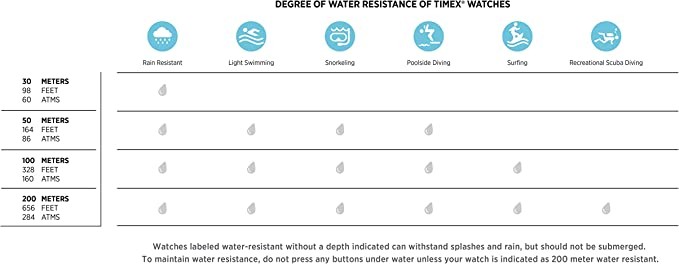 Water resistance to 30 meters (100 feet): generally splash-proof or can be submerged briefly in water, but not suitable for swimming or bathing